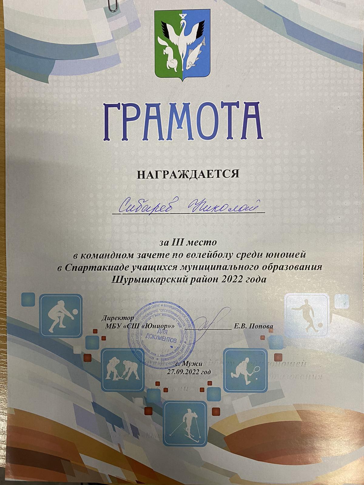 Сибраев Николай 3 место по волейболу