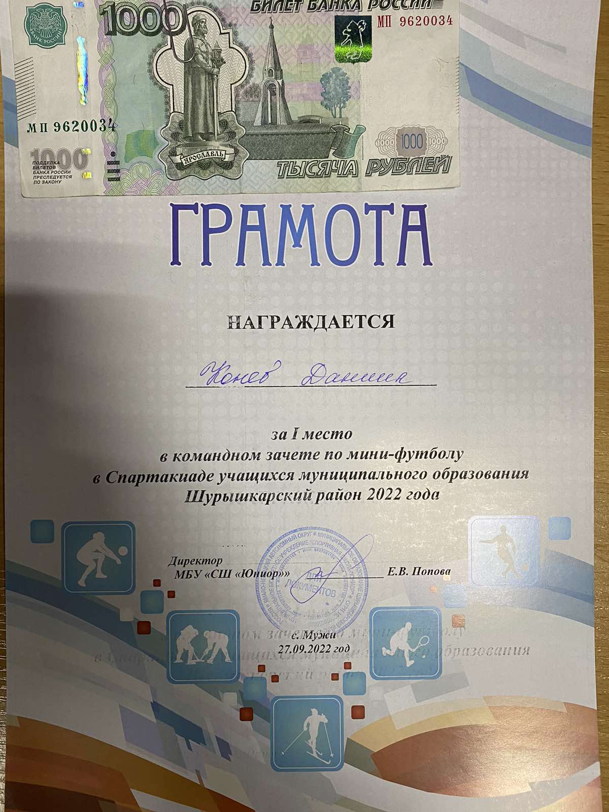 Конев Даниил , 1 есто по мини футболу