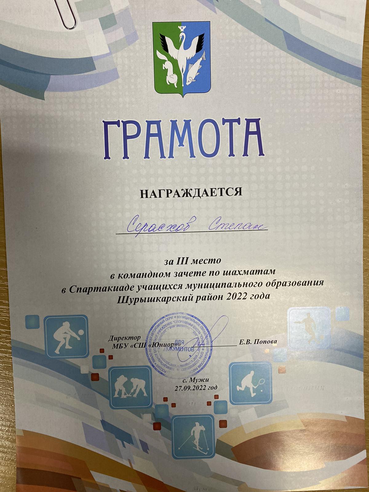 Серасхов Степан , 3 место по шахматам